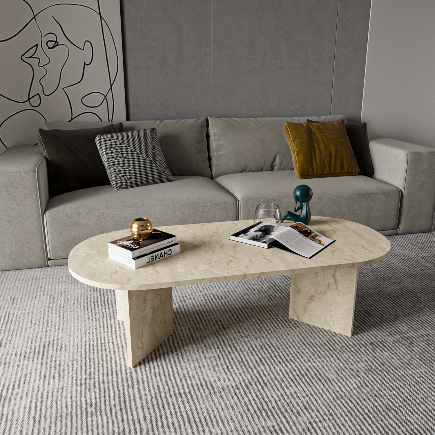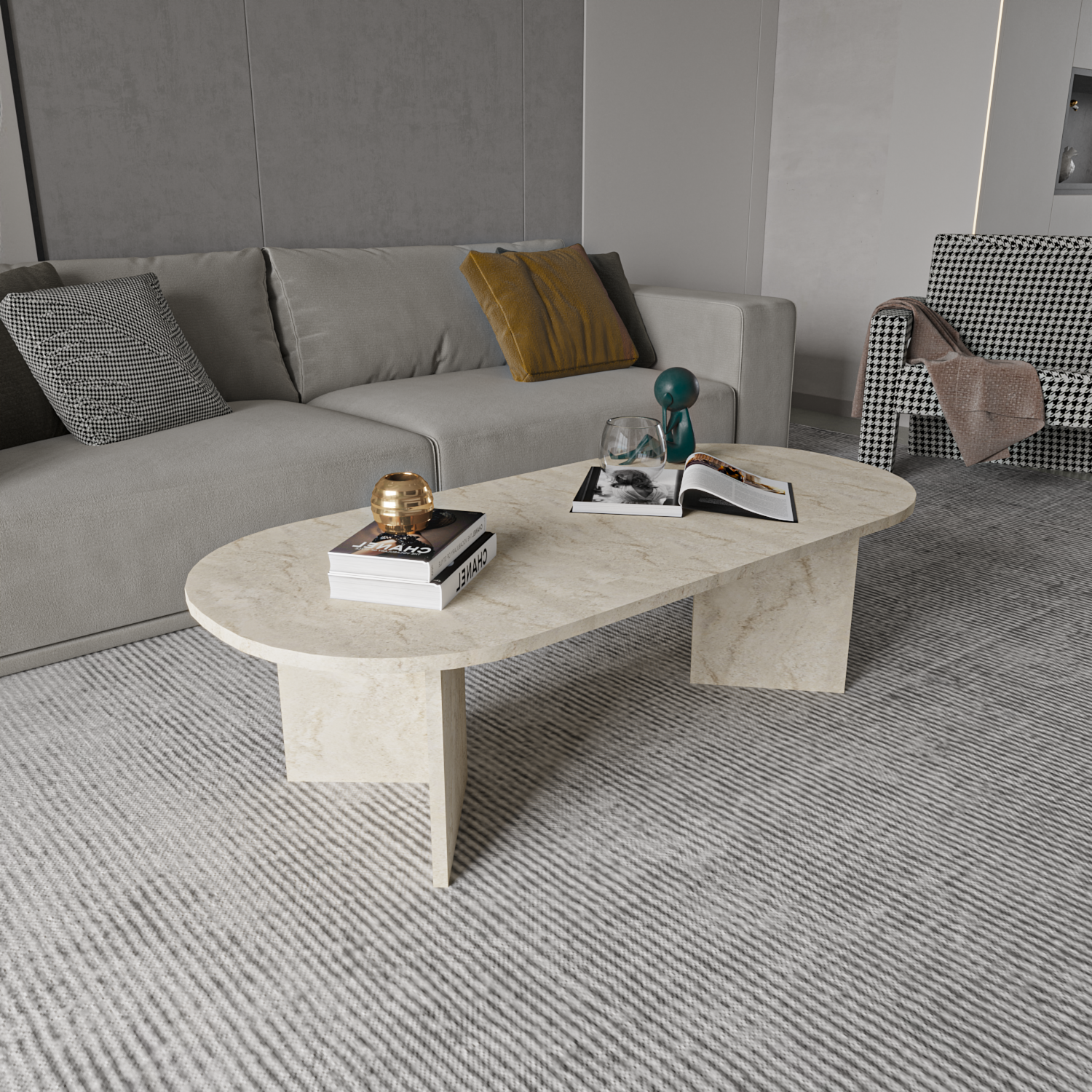 Şıklığı ve işlevselliği bir araya getiren elips şeklindeki bu orta sehpa, modern tasarımıyla yaşam alanlarınıza estetik bir dokunuş katıyor. Traverten desenli suntalam yüzeyi, doğal taş görünümü sunarken, sağlam yapısıyla uzun ömürlü kullanım sağlıyor.