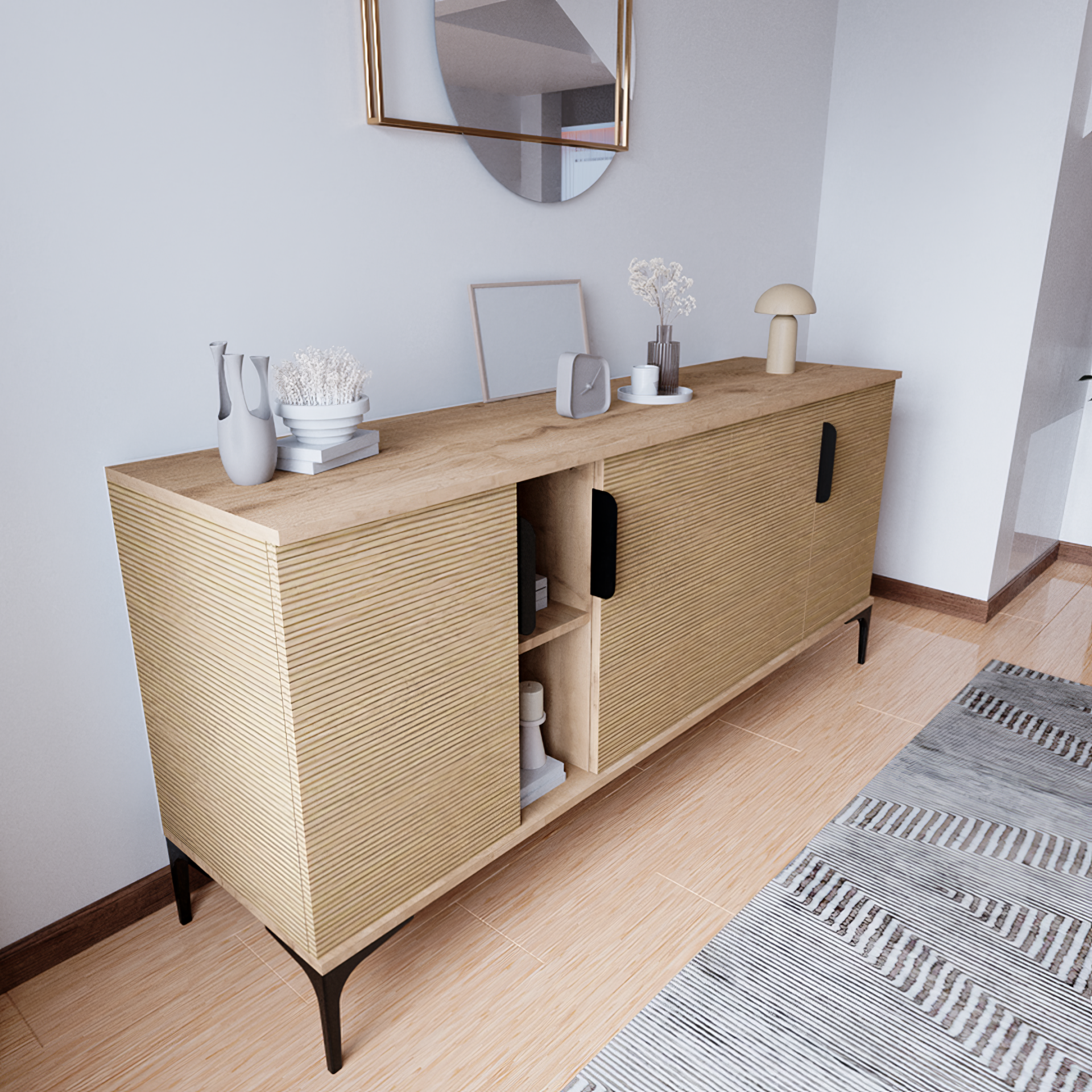 - İster yemek odasında, ister salonda ya da girişte şıklıkla kullanabileceğiniz bu konsol;hem depolama çözümühem de göz alıcı bir tamamlayıcı parçaolarak öne çıkıyor.