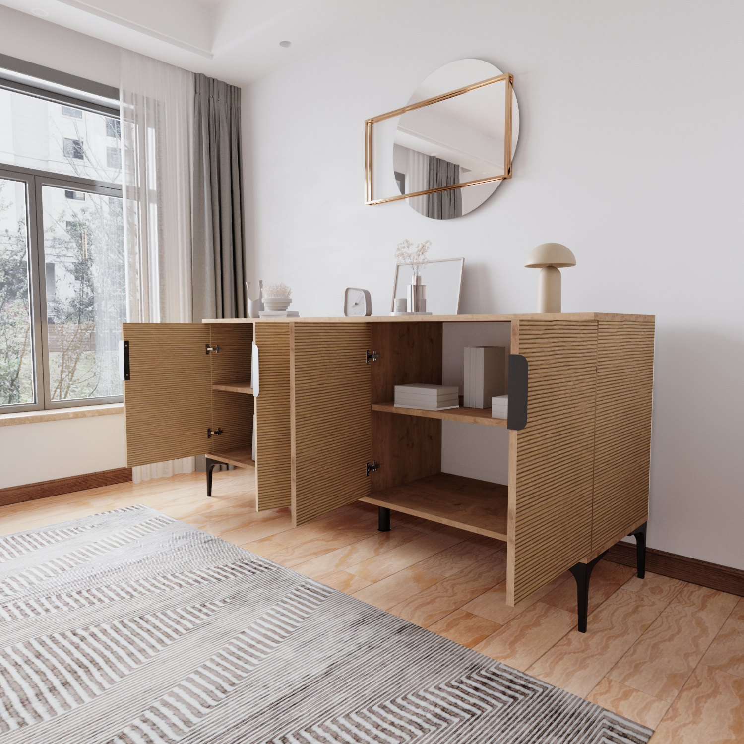 - Raflı ve açık bölmeli tasarım– Kitaplar, dekor objeleri, çerçeveler ve daha fazlası için mükemmel