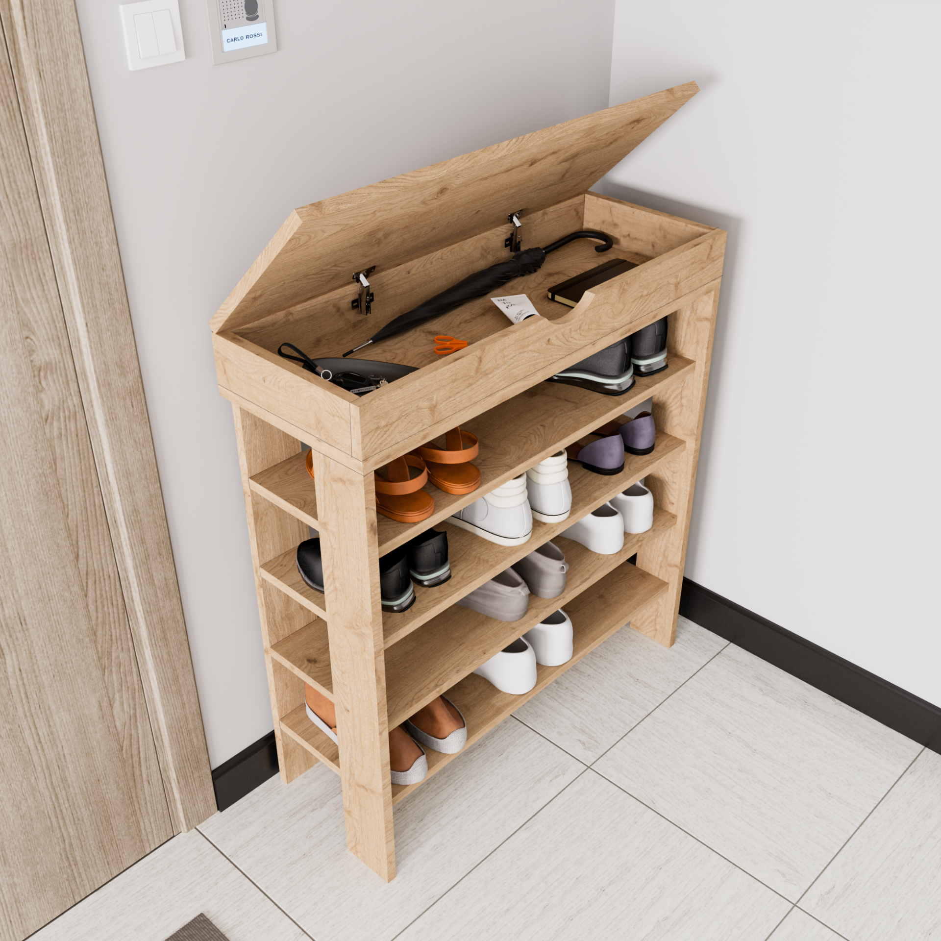 Üst kısmındaki saklama alanı, şemsiye, ayakkabı boyası, bezve diğer küçük eşyalarınızı düzenli tutmak için mükemmel bir alan sunar. Bu özellik, özellikle dar alanlariçin son derece pratik bir çözüm sağlar ve yerden tasarruf etmenize yardımcı olur. Kompakt boyutlarısayesinde her eve kolayca uyum sağlar.